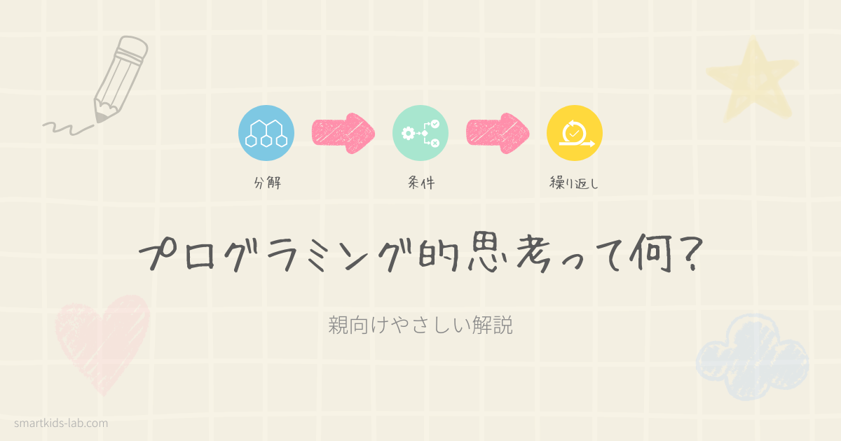「プログラミング的思考」──2020年度の小学校プログラミング教育必修化とともに広まった言葉ですが、2026年3月現在でも意味を正確に説明できる保護者はどれくらいいるでしょうか。文部科学省の定義を読むと「自分が意図する一連の活動を実現するために、どのような動きの組合せが必要であり、一つ一つの動きに対応した記号を、どのように組み合わせたらいいのか、記号の組合せをどのように改善していけば、より意図した活動に近づくのか、といったことを論理的に考えていく力」と書かれています。正直、これだけ読んで「なるほど!」と膝を打てる親は少ないはずです。